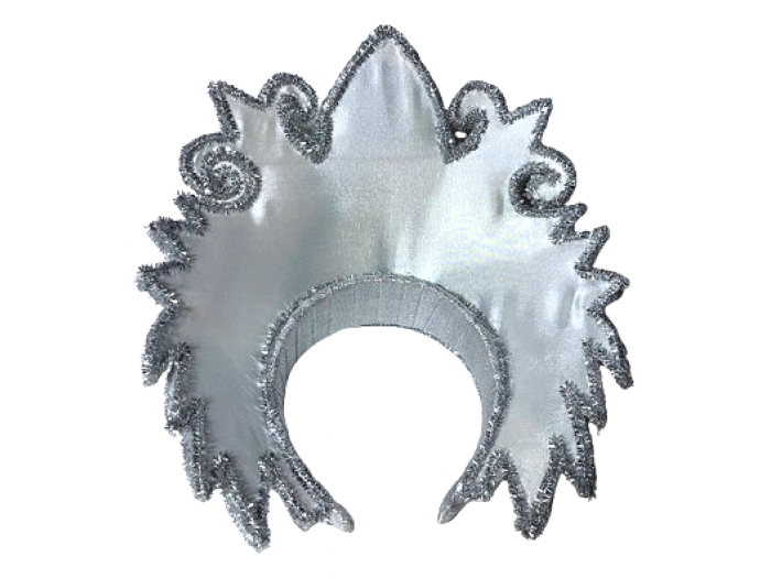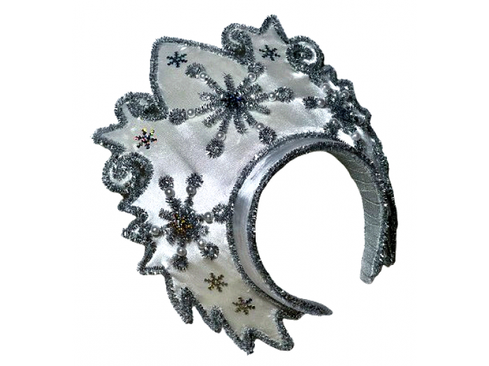 Лицьова частина корони прикрашена великими об’ємними сніжинками зі сріблястої синелі та перламутровими білими намистинами під перли. Декор гарно переливається на світлі та додає виробу святкової розкоші.
