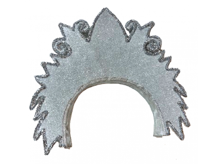Основою корони слугує тонкий, але міцний картон, обтягнутий тканиною. Поверх неї акуратно наклеєний сріблястий глітерний фоаміран, який красиво переливається на світлі та створює ефект морозного блиску. По контуру корона оздоблена блискучою синельною дротинкою срібного кольору, що підкреслює форму виробу та додає йому завершеності.