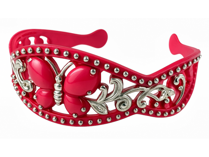 Тело обруча выполнено в форме широкой волнистой полосы, украшенное серебряными элементами "3 бабочки" и дополненное по всей поверхности имитацией камней.
